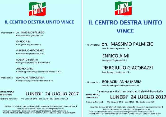 A Modena Forza Italia lancia una iniziativa per promuovere un centrodestra unito: 'Il centrodestra unito vince recita il volantino'. Si tratta di una cena a Maranello, nulla di chè, solita roba per raccogliere un po' di fondi e dimostrare di esistere. Ma almeno le intenzioni sembrano buone.
