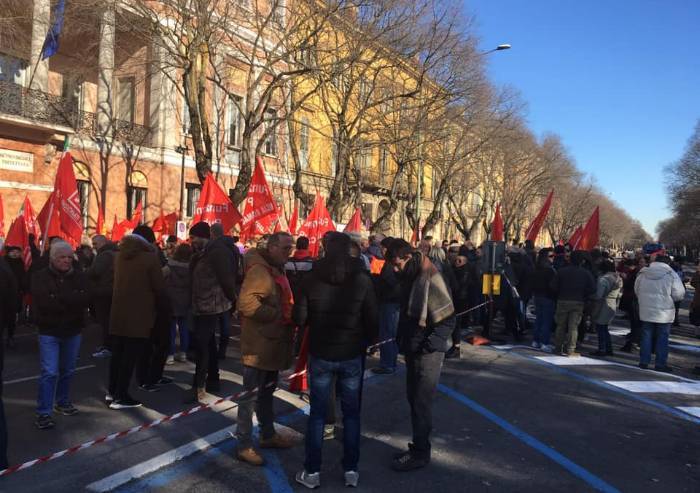 Mentre alcuni funzionari sono stati ricevuti nei locali del prefetto Maria Patrizia Paba, in viale Martiri si susseguono i comizi del sindacato modenese e di quello dell'Emilia-Romagna: parlano il segretario Fiom di Modena, Cesare Pizzolla, il segretario della Camera del lavoro, Manuela Gozzi, il segretario della Cgil Emilia-Romagna, Luigi Giove, tra gli altri. Tutto è partito dalla vertenza della Frama Action, azienda di Novi che la multinazionale austriaca Hella vuol far traslocare il 6 marzo chiudendo la produzione locale, nonostante l'opposizione della Regione, a cura al momento una ventina di lavoratori.
