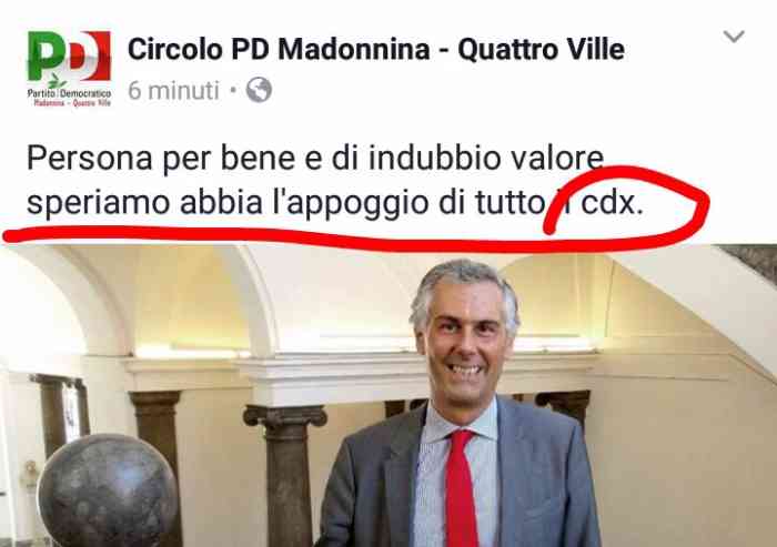 Alle regionali in Sicilia come noto il Pd ha deciso di sostenere Fabrizio Micari rinunciando all'accordo con la sinistra bersaniana. Tutto bene se non che a Modena il Pd Madonnina sulla sua pagina Facebook pubblica un bell'endorsement a Micari: 'Persona perbene, speriamo abbia l'appoggio di tutto il centrodestra'. Una gaffe poi corretta ma che dimostra (se mai ce ne fosse bisogno) tutto il trasformismo del Pd Renziano. Una mutazione da centrosinistra a centrodestra berlusconiana, ovviamente nessuno lo dica agli elettori e ai 'volontari' delle feste Pd