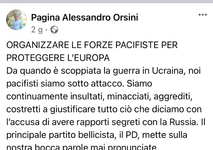 'Eppure noi pacifisti abbiamo a cuore la vita degli ucraini più di tutti. A guidare gli attacchi è un gruppo organizzato di parlamentari del PD, che si avvantaggia della mancanza di un partito pacifista in parlamento. Anziché attaccare un partito politico rivale, il PD si coordina per attaccare privati cittadini pacifisti, inclusi studiosi, giornalisti, scrittori, artisti e persone comuni - continua Orsini -. È giunto il momento che i pacifisti smettano di giustificarsi. Da adesso in poi, saranno i bellicisti del PD a giustificarsi e a dare spiegazioni per le loro politiche inumane verso il popolo ucraino volte ad alimentare la guerra dall’esterno per la sirianizzazione del conflitto. È necessario organizzare un contrattacco pedagogico e culturale in difesa dei valori più profondi dell’Italia, che sono i valori della pace.