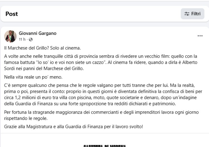'C’è sempre qualcuno che pensa che le regole valgano per tutti tranne che per lui. Ma la realtà, prima o poi, presenta il conto: proprio in questi giorni è diventata definitiva la confisca di beni per circa 1,2 milioni di euro tra villa con piscina, moto, quote societarie e denaro, dopo un’indagine della Guardia di Finanza su una forte sproporzione tra redditi dichiarati e patrimonio. Per fortuna la stragrande maggioranza dei commercianti e degli imprenditori lavora ogni giorno rispettando le regole. Grazie alla Magistratura e alla Guardia di Finanza per il lavoro svolto' - scrive Gargano.