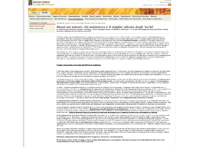 “Il documento ufficiale (foto sopra), reperibile sul sito della Provincia di Reggio Emilia parla chiaro ed in esso si sosteneva “che va combattuta ogni sorta di minimizzazione degli abusi e che “la psicoterapia è un salvavita per queste piccole vittime”. Nel medesimo comunicato si tesseva le lodi proprio del progetto Bibbiano. Particolarmente significativo questo passaggio: “In Val d’Enza, in cui i fenomeni di violenza sono emersi prima che in altri territori, si sono sperimentate innovative modalità di presa in carico delle vittime, ascolto, accoglienza, cura e infine accompagnamento in giudizio: anche il perseguimento del crimine necessita di un sostegno professionale adeguato. L’Unione Val d’Enza si è organizzata per affrontare il fenomeno della violenza sui minori, ed insieme all’Ausl, e all’Associazione Casina dei Bimbi ha aperto nei mesi scorsi un centro di riferimento per il maltrattamento e abuso.