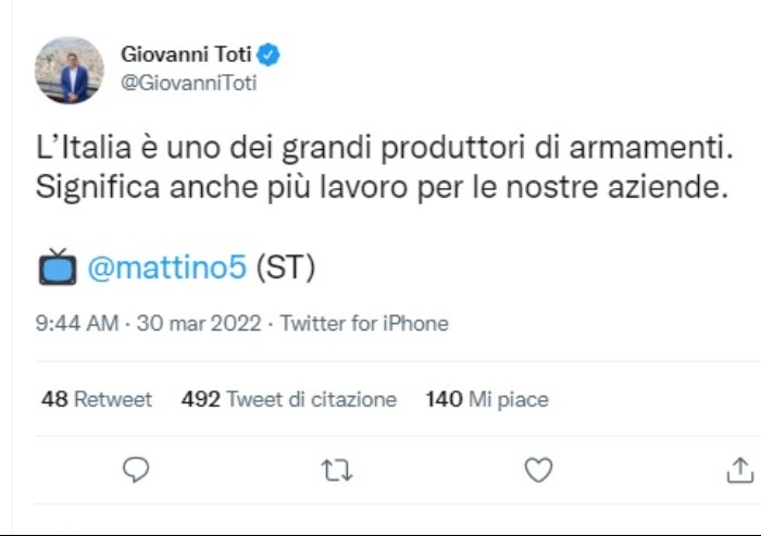 'L’Italia è uno dei grandi produttori di armamenti. Significa anche più lavoro per le nostre aziende'. A dirlo è stato ieri il governatore della Liguria Giovanni Toti ospite di Mattino 5. Un concetto pubblicato anche su Twitter. Evidente il richiamo al tema dell'aumento della spesa militare. Ricordiamo che, tra i colossi, nel 2020 Leonardo e Fincantieri assieme hanno generato vendite per un totale di 13,8 miliardi, pari al 2,6% del fatturato complessivo delle top 100 aziende produttori di armi al mondo.