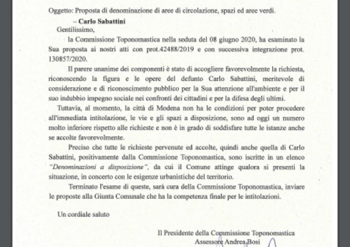 Ma non è finita qui, perché: 'Tuttavia al momento la città di Modena non ha le condizioni per poter procedere alla immediata intitolazione, le vie e gli spazi a disposizione sono ad oggi un numero molto inferiore rispetto alle richieste e non è in grado di soddisfare tutte le istanze anche se accolte favorevolmente'.
