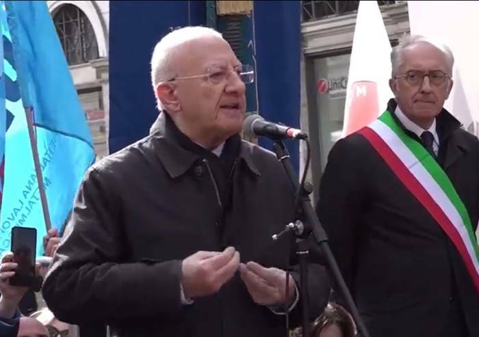 'Si firmi la prossima settimana l’Accordo di coesione con la Campania - ha tuonato il presidente De Luca dal palco -. Siamo qui per bloccare il racconto infame per il quale al Nord c’è la virtù e al Sud i cialtroni. Siamo qui a difesa della dignità del Sud e dell’unità d’Italia. Vorrei che il presidente Meloni chiedesse scusa al Sud. Il fondo sviluppo e coesione è destinato al Sud, prevede che l’80 per cento delle risorse vadano al Sud e il 20 per cento al Nord. Un governo che avesse avuto un briciolo di dignità avrebbe concordato l’accordo di coesione in primo luogo con tutte le regioni del Sud, non con quelle del Nord. Ha dimostrato di non avere dignità politica, e disprezzo nei confronti del sud. Pensano di gestire i fondi come se fossero un bottino privato.