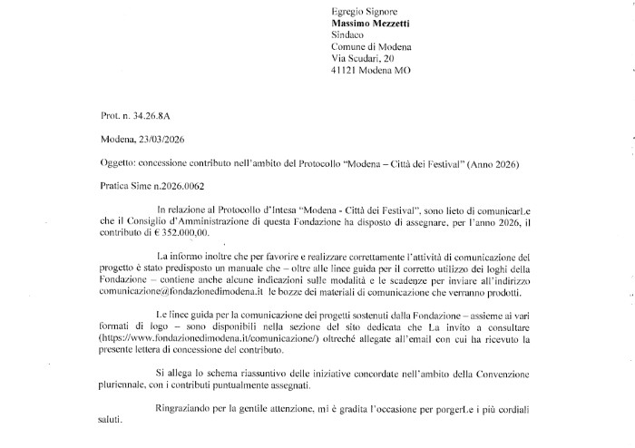 comune il mantenimento, la valorizzazione e lo sviluppo della cultura nel territorio modenese; sviluppare politiche unitarie di fundraising con l’obiettivo di garantire una crescente sostenibilità economica del progetto nel tempo, curandone al contempo la sostenibilità sociale ed ambientale; consolidare l'immagine unitaria e la comunicazione coordinata del progetto, programmarne il calendario, individuare la forma più idonea per la catalizzazione di interesse e l'attrazione di risorse, e intraprendere tutte le iniziative di richiamo internazionale volte allo sviluppo dell’audience del progetto; sviluppare e proporre un nuovo progetto di promozione turistica “Modena Città dei Festival”, un brand che unisce i Festival con attrattività turistica, con l’obiettivo di promuoverli unitariamente attraverso specifici strumenti di promozione turistica'.Tutto ciò premesso 'Fondazione di Modena ha disposto di assegnare, per l’anno 2026, un contributo di 352.000 euro, a fronte di un progetto di pari importo'.