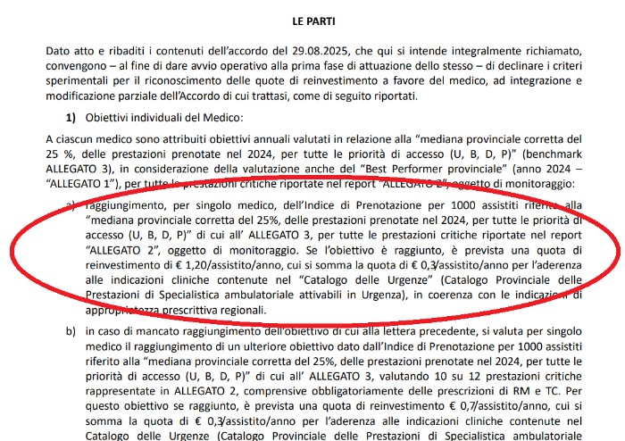 'A ciascun medico - si legge nell'addendum della delibera del 28 ottobre firmata dal direttore generale Ausl Mattia Altini e dal segretario provinciale Fimmg Dante Cintori (lo Snami e lo Smi non hanno firmato) - sono attribuiti obiettivi annuali valutati in relazione alla mediana provinciale corretta del 25%, delle prestazioni prenotate nel 2024, per tutte le priorità di accesso. Se l’obiettivo è raggiunto, è prevista una quota di reinvestimento di 1,20 euro per assistito all'anno, cui si somma la quota di 0,3 euro per assistito all'anno per l’aderenza alle indicazioni cliniche contenute nel “Catalogo delle Urgenze” in coerenza con le indicazioni di appropriatezza prescrittiva regionali. In caso di mancato raggiungimento dell’obiettivo di cui alla lettera precedente, si valuta per singolo medico il raggiungimento di un ulteriore obiettivo dato dall’Indice di Prenotazione per 1000 assistiti riferito alla mediana provinciale corretta del 25%, delle prestazioni prenotate nel 2024, per tutte le priorità di accesso valutando 10 su 12 prestazioni critiche, comprensive obbligatoriamente delle prescrizioni di Tac e risonanza. Per questo obiettivo se raggiunto, è prevista una quota di reinvestimento 0,7 euro per assistito all'anno, cui si somma la quota di 0,3 euro per assistito all'anno per l’aderenza alle indicazioni cliniche contenute nel Catalogo delle Urgenze in coerenza con le indicazioni di appropriatezza prescrittiva regionali. I compensi sono al netto degli oneri previdenziali a carico dell’Azienda'.