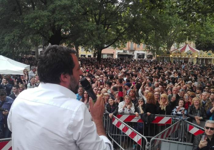 'Venite su con le telecamere a vedere qual è la Modena vera, non quella di quattro zecche da centro sociale che vanno in giro a far casino. Grazie di cuore'. Lo dice Matteo Salvini appena arrivato sul palco di Modena, davanti ad una piazza Matteotti piena. Salvini invita i giornalisti a salire sul palco per documentare la folla, dice, mentre in lontananza si sentono i cori dei presidi di protesta, come quello della Cgil nella vicina piazza Mazzini. Tutta l'area è comunque ben presidiata dalle forze dell'ordine, con oltre un centinaio di agenti in tutto. Appena arriva qualche fischio da lontano, Salvini s'interrompe sul palco e scandisce di fronte ai suoi riferito ai contestatori: 'Non vi si sente, non ci sono più i compagni di una volta, hanno perso la voce perchè hanno fatto tardi al centro sociale ieri sera. Anche a voi qui dico - si rivolge il vicepremier alla piazza - meno canne e più uovo sbattuto della nonna, che state meglio'. Sul palco di Modena, al fianco di Salvini e di tuti i dirigenti della Lega locali, compreso il candidato sindaco del centrodestra a Modena Stefano Prampolini, c'è anche l'ex campione del mondo Luca Toni, che Salvini definisce 'grande sportivo e grande uomo'.