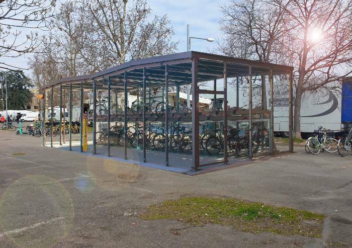 Il nuovo deposito protetto si andrà ad aggiungere agli otto già in funzione in città, cinque a gabbia metallica e tre con struttura in vetro: Porta nord - Via R. L. Montalcini (60 posti), Stazione FS - via dell'Abate (162 posti), Stazione FS - P.zza Dante (60 posti), Autostazione-via Fabriani (12 posti), Stazione piccola 1 - P.zza Manzoni (12), Stazione piccola 2 - P.zza Manzoni (40 posti), Novi Sad - via Bono da Nonantola (12 posti), Policlinico - via Scanaroli (12 posti).
