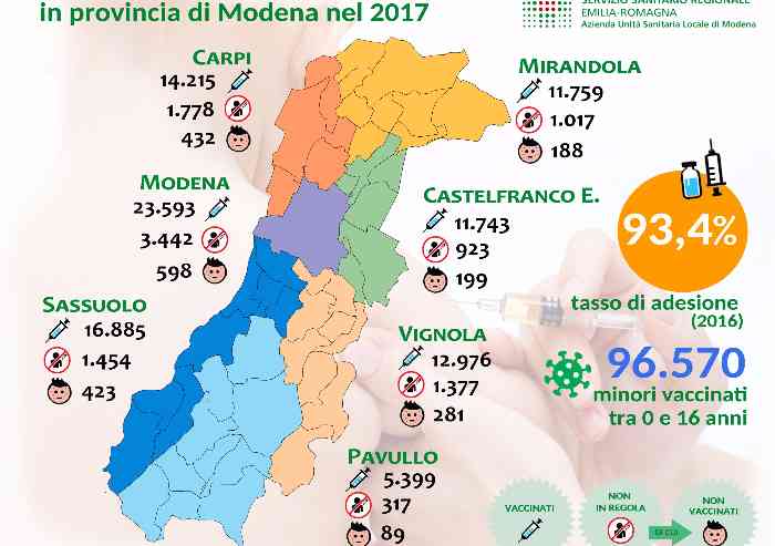A dieci giorni dall’inizio dell’anno scolastico in provincia di Modena risultano adempienti alla nuova Legge 119/2017 sull’obbligo vaccinale 96.570 minorenni d’età compresa tra 0 e 16 anni, con un tasso di adesione al piano vaccinale pari al 93,4%.