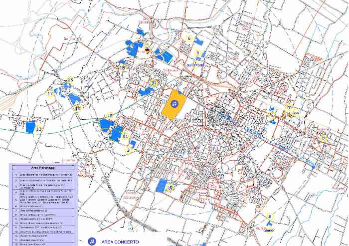 Ma ecco per completezza la mappa di tutti i 18 parcheggi disegnata dal Comune in vista del maxi concerto.