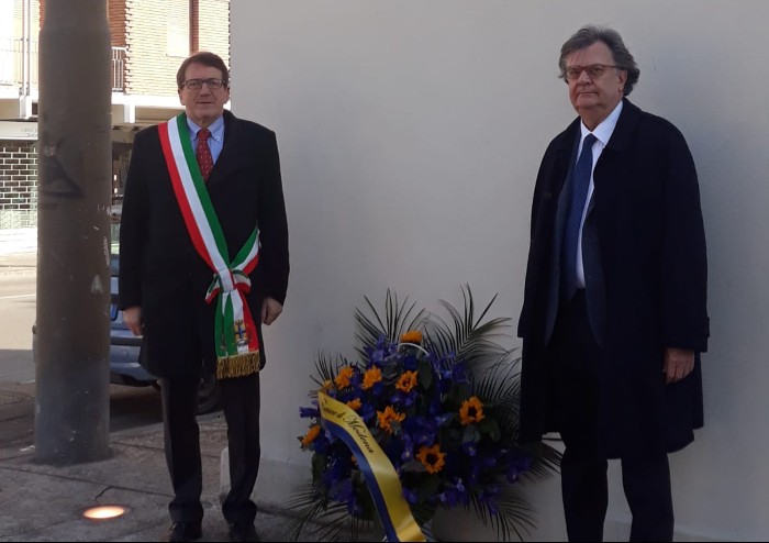 momento della celebrazione in ricordo di Biagi lo scorso anno col sindaco e il rettore: quest'anno nemmeno questa cerimonia è stata fatta.