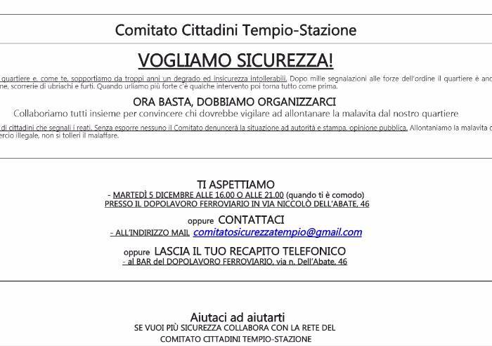 Decine di volontari del Comitato Tempio-Stazione hanno diffuso ovunque nel quartiere un volantino per chiamare i residenti a formare una rete che segnali i reati, le situazioni di degrado sociale, di insicurezza.