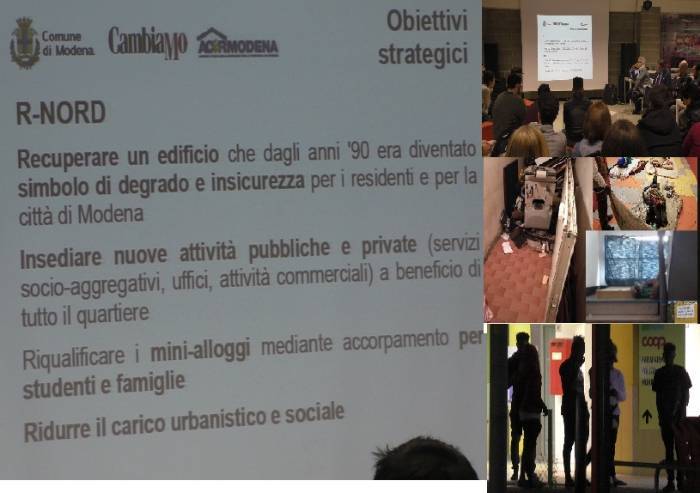 La sede è quella dell'Happen, l'unico luogo aperto tra i tanti locali dei seminterrato del comparto R-Nord, gradualmente abbandonati dai privati che negli anni, a causa del crescente degrado, sono scappati e non sono più tornati. ll Centro Happen, gestito dalla Cooperativa Sociale Il Girasole, nato nel 2012 con l'idea di avere uno spazio in cui i giovani possano incontrarsi, ospita per l'occasione il Sindaco Giancarlo Muzzarelli e Luca Biancucci, architetto e presidente di CambiaMo, la società partecipata dal Comune che da dieci anni a questa parte ha avuto il compito di attuare quella riqualificazione che per il Comune è praticamente conclusa e riuscita. E che come tale viene illustrata dalle slide alla platea di giovani che, capiamo poco dopo essere entrati, è organizzata e costituita dai ragazzi del PD, la Gioventù Democratica presenti insieme ad alcuni ragazzi dello studentato creato. Un centinaio di posti letto già attivi nello stabile, ad un costo medio mensile di 250 euro, compresi di utenze.