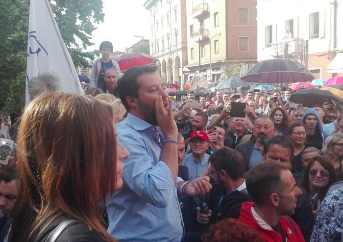 Solito bagno di folla per Matteo Salvini dopo le polemiche generate dal suo arrivo a Vignola in occasione di Bambinopoli. Il leader nazionale della Lega ha fatto tappa in provincia di Modena per lanciare, come previsto, la candidatura a presidente di Lucia Borgonzoni alle Regionali emiliano-romagnole. Nemmeno il tempo di autorizzare e montare un palco. Il microfono ad un solo altoparlante messo a disposizione in breve tempo dai volontari leghisti, non regge, come a Bibbiano, e Salvini va a squarciagola. La pioggia, che aveva iniziato a cadere al suo arrivo, smette, sulla piazza splende a tratti il sole. 'A Roma hanno fatto una cosa vergognosa, e a Roma come a Bologna non ci dicono ancora quando votare. E' una cosa incredibile. Vedo Bonaccini in difficoltà, ora punta sull'alleanza con i 5 stelle anche qui, ma è meglio così. Anzi spero che la facciano l'ammucchiata, così il loro disegno contro Salvini è ancora più chiaro ai cittadini'