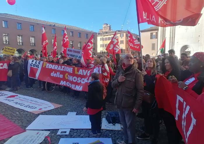 'Da diversi mesi, e ormai da 2 anni, portiamo avanti la mobilitazione unitaria di Cgil e Uil per rivendicare un modello alternativo e diverso di società da quello che stiamo vivendo – ha spiegato Daniele Dieci segretario Cgil Modena - la manovra Finanziaria del Governo peggiora le condizioni dei lavoratori e pensionati che rappresentiamo: si va in pensione più tardi, si guadagna meno, non ci sarà 1 euro in più nelle buste paga dei lavoratori, si taglia su sanità e scuola e su tutti i finanziamenti per la sicurezza sul lavoro, sul traporto pubblico. Non contrasta il precariato. Non è la società che vogliamo. Il nostro modello di Pese è completamente antitetico a quello delineato dalla legge Finanziaria, non risponde alle esigenze delle persone”. “Questo Governo non propone una visione alternativa – prosegue Dieci - aumenta il precariato, tagliano sanità pubblica, scuola, pubblico impiego, sicurezza sul lavoro, sono più di 700 le vittime sul lavoro da inizio anno, non ci basta lasciar fare all’impresa, vogliamo realizzare un’idea alternativa di società e mettere al centro della vita delle persone'.