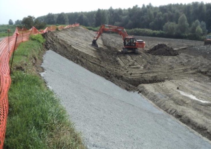 · nella messa in sagoma finalizzata sia alla copertura della linea d’imbibizione ed al contrasto dello sfiancamento, sia al raggiungimento di un adeguato coefficiente di sicurezza alle sollecitazioni sismiche (particolarmente grave nel tratto di valle, caratterizzato da forti dislivelli rispetto al piano campagna in assenza di banche);