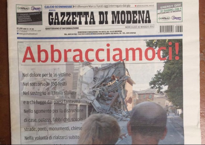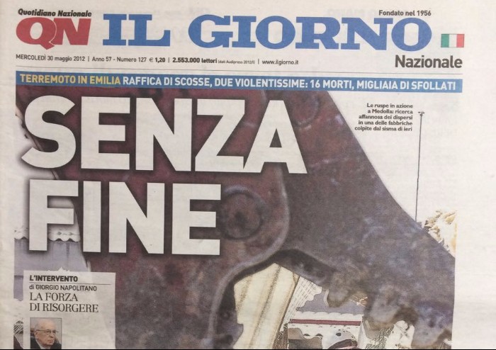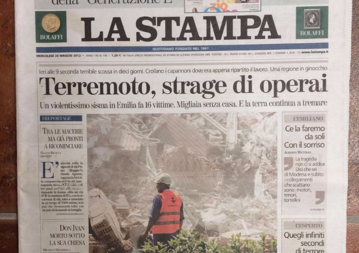 Nei giornali del 30 maggio 2012 le fotografie di un dramma che ancora scuote. Sono passati cinque anni da quella seconda scossa che portò la morte nella nostra terra, dopo la devastazione del 20 maggio.
