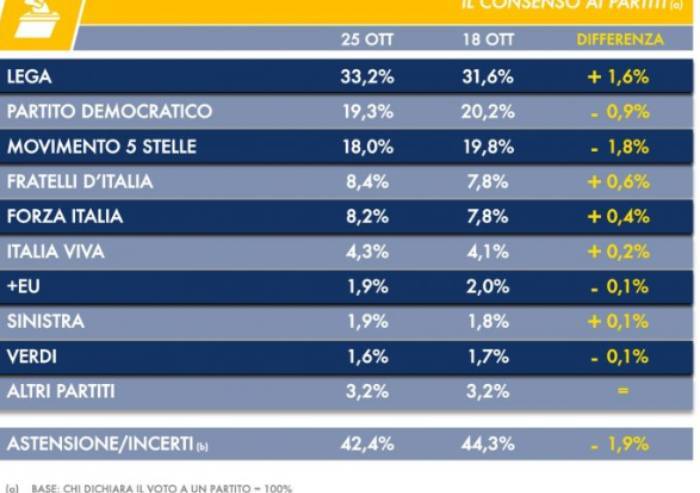 C’è sempre meno fiducia nel governo Conte 2 da parte degli italiani. Il consenso è diminuito dello 0,6% nell’ultima settimana. La fiducia continua a crollare da settimane. Se il 4 ottobre il 32,6% degli italiani si dichiarava favorevole all’esecutivo giallorosso, oggi la percentuale è scesa al 30%. Solo una settimana fa era al 30,6%. Consequenzialmente aumenta chi non ha fiducia (57,3%, +0,4% rispetto a sette giorni fa). Senza opinione il 12,7%.