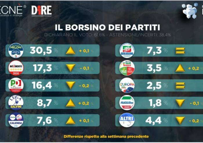 Continua la crescita di Fratelli d’Italia, che arriva il 30,5%. Continua a calare, seppur leggermente, il Movimento 5 stelle dopo la risalita delle scorse settimane, così anche il Pd che perde un ulteriore 0,2%.