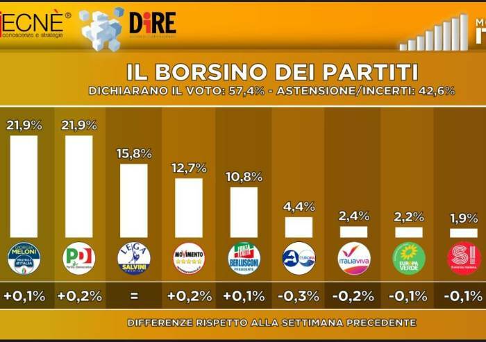 Sondaggio Dire, Fdi e Pd appaiati: astensione al 42%