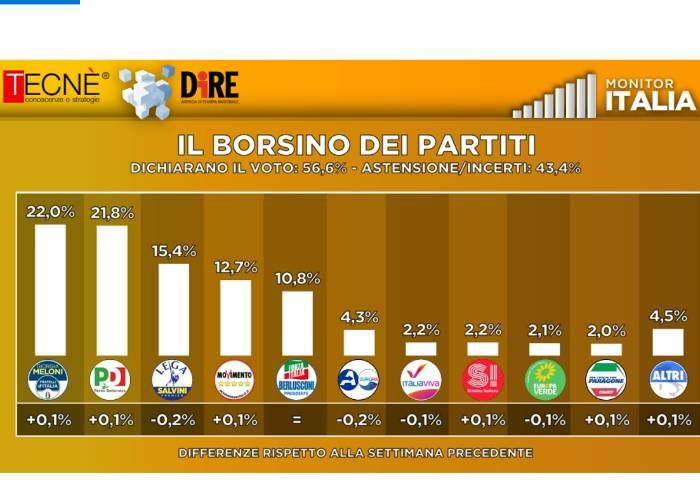 Seguono: M5s al 12,7% (+0,1%); Forza Italia stabile al 10,8%; Azione-+Europa al 4,3% (-0,2%); Italia Viva al 2,2% (-0,1%); Sinistra Italiana al 2,2% (+0,1%); Europa Verde al 2,1% (-0,1%); Italexit con Paragone 2,0% (+0,1); altri 4,5% (+0,1%).
