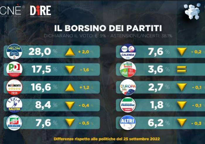 Dal punto di vista dei partiti, Fratelli d’Italia si conferma il primo partito italiano, in crescita anche dopo le politiche del 25 settembre, attestandosi al 28% con un +2% rispetto alle urne. Scende la Lega, sale il M5S. Il Carroccio perde lo 0,4 scendendo all’8,4%, il Pd è al 17,5% con un -1,6% rispetto al voto, il partito di Conte è al 16,6% aumentando dell’1,2%. Forza Italia è al 7,6% con un -0,5. Tra i piccoli cala Azione/Italia Viva (-0,2) al 7,6%, Europa Verde è stabile al 3,6, +Europa perde lo 0,1% con il 2,7, Italexit è al 1,8% (-0,1).