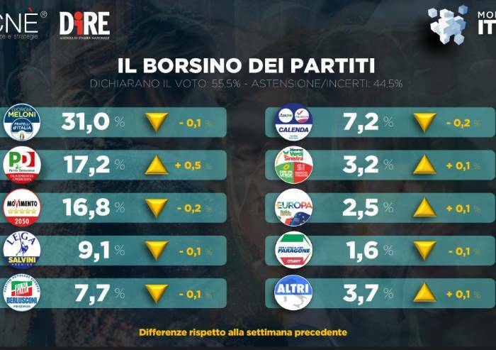 Nel borsino dei partiti Fratelli d’Italia si conferma stabilmente al primo posto con il 31% dei consensi, perdendo lo 0,1% nell’ultima settimana. E’ quanto emerge dal sondaggio Dire-Tecnè con interviste realizzate tra il 23 e il 24 febbraio su un campione di mille persone. Balzo del Partito democratico che supera al secondo posto il Movimento 5 stelle. Il Pd recupera lo 0,5% e si attesta al 17,2%. Giù dello 0,2 il M5s che scende al 16,8%. Sotto il podio la Lega con il 9,1% (-0,1%), Forza Italia al 7,7% (-0,1%) tallonata dal Terzo Polo al 7,2%, che però è ancora in discesa e perde lo 0,2%. Più staccati Verdi-Sinistra al 3,2% (+0,1%), +Europa al 2,5% (+0,1%), Paragone all’1,6% (-0,1%).