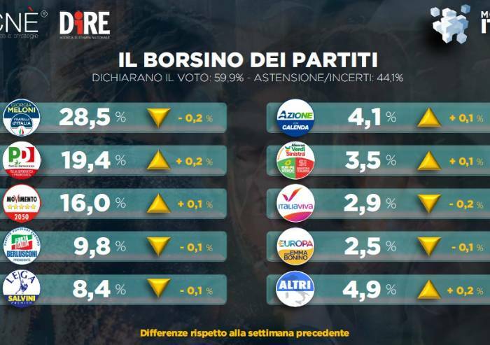 Il primo partito italiano è sempre Fratelli d’Italia al 28,5% malgrado lo 0,2% perso nell’ultima settimana. Quindi il Pd con 19,4% (+0,2%) e il M5s con 16% (+0,1%). Scende Forza Italia al 9,8% (-0,1%). La Lega perde 0,1% e si posiziona ora all’8,a%. Quindi Azione, sesto partito, che guadagna 0,1% negli ultimi sette giorni e sale al 4,1% complessivo. In aumento di +0,1% anche Verdi-Sinistra 3,5%, mentre Italia Viva cala al 2,9% (-0,2%) e +Europa al 2,5% (-0,1%).