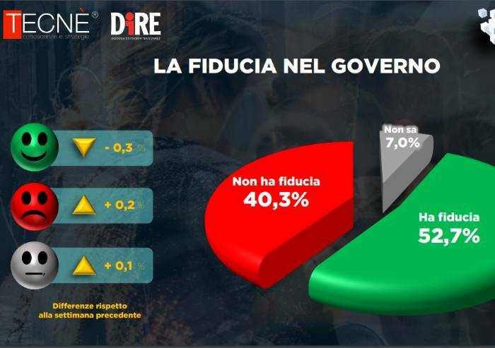 Scende ancora, stavolta dello 0,3%, la fiducia nel Governo nell’ultima settimana: ora si attesta al 52,7%. E’ quanto emerge dal sondaggio Dire-Tecnè con interviste effettuate il 9 e 10 marzo 2023 su un campione di mille persone.