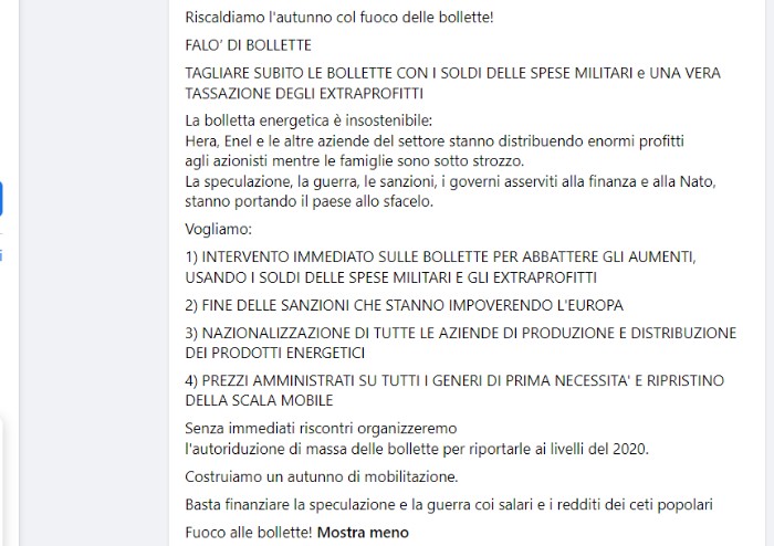 'La bolletta energetica è insostenibile: Hera, Enel e le altre aziende del settore stanno distribuendo enormi profitti agli azionisti mentre le famiglie sono sotto strozzo - affermano gli organizzatori -. La speculazione, la guerra, le sanzioni, i governi asserviti alla finanza e alla Nato, stanno portando il paese allo sfacelo'.