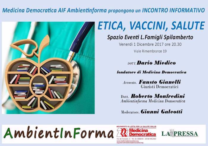 'Abbiamo sempre amato il contraddittorio e abbiamo sempre voluto che fosse il nucleo dei nostri dibattiti e delle serate informative organizzate. Ma quando come medici di Medicina Democratica abbiamo cercato un professionista specialista in vaccini sul fronte istituzionale, che garantisse un contraddittorio con il Dr. Dario Miedico, ospite nella nostra serata (oggi 20,30 sala Famigli Spilamberto), nessuno ha accettato l'invito. Anzi siamo stati anche offesi. Un atteggiamento di chiusura che ci ha confermato quanto sia importante parlare ed informare, consapevolmente e professionalmente, da medici, che pongono dei dubbi e soprattutto vogliono informare e rispondere ai cittadini, e alle famiglie che, pur partendo dal presupposto di vaccinarsi e fare vaccinare i propri figli pongono dei quesiti sul piano etico, legato per esempio all'obbligatorietà. Noi cercheremo questa sera di dare risposte, sotto l'aspetto scientifico, etico e giuridico. Purtroppo avremo e lasceremo una sedia vuota. Riservata a chi ha rifiutato l'invito e che sarà comunque libero di unirsi a noi e al nostro dibattito in qualsiasi momento'