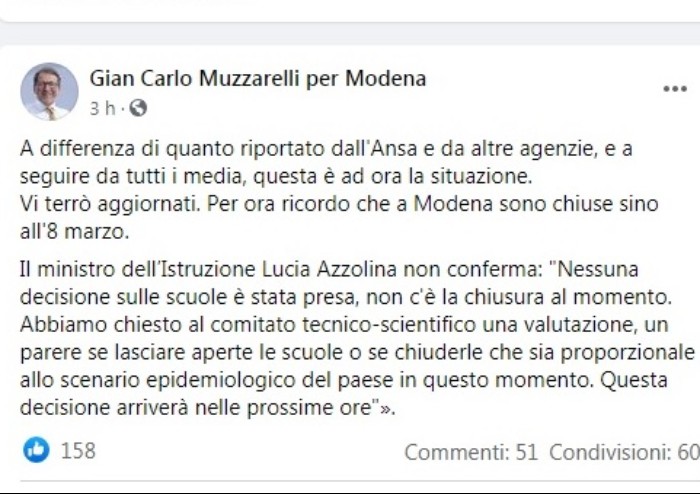Per ora ricordo che a Modena sono chiuse sino all'8 marzo. Il ministro dell’Istruzione Lucia Azzolina non conferma: 'Nessuna decisione sulle scuole è stata presa, non c'è la chiusura al momento. Abbiamo chiesto al comitato tecnico-scientifico una valutazione, un parere se lasciare aperte le scuole o se chiuderle che sia proporzionale allo scenario epidemiologico del paese in questo momento. Questa decisione arriverà nelle prossime ore'».