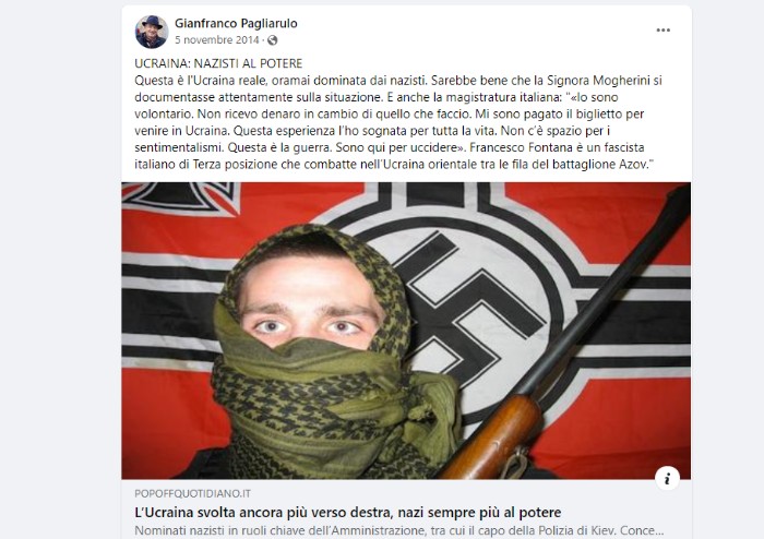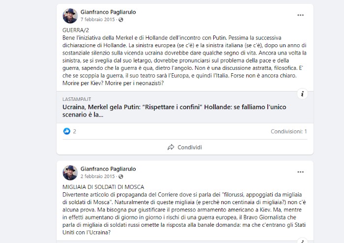 'Da non credere: davanti all'ennesimo, rivoltante massacro operato dai nazisti di Kiev, sostenuti dall'occidente, Repubblica fa capire che non si sa chi ha sparato perchè ciascuna parte accusa l'altra. Insomma, può essere che gli indipendentisti si siano bombardati da soli. Ma come si fa a essere non solo così faziosi, ma anche così stupidi?' - aggiungeva a ottobre 2014 Pagliaruolo attaccando anche i giornali italiani, a partire da Repubblica e Corriere. 'In Ucraina c'è la guerra civile, dichiarata e praticata da un governo impossessatosi del potere con la violenza dei nazisti di Svoboda e di Settore Destra. Come volevasi dimostrare'.