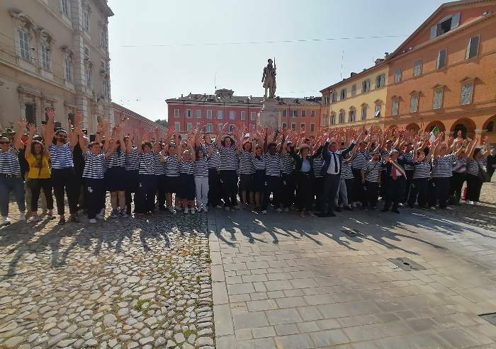 Dopo un'ora circa si giunge quasi al termine. Anche perché il sole, sul cemento e sul selciato di piazza Roma, picchia forte. Per tutti. Come picchiano i ragazzi della banda Rulli Frulli sui tamburi che accompagnano il finale musicale della manifestazione. Banda che dopo l'ultimo brano si sposta con suoi componenti ed il suo maestro, Alberghini, anch'egli insignito con l'ordine al merito, per una foto di gruppo insieme al Prefetto.