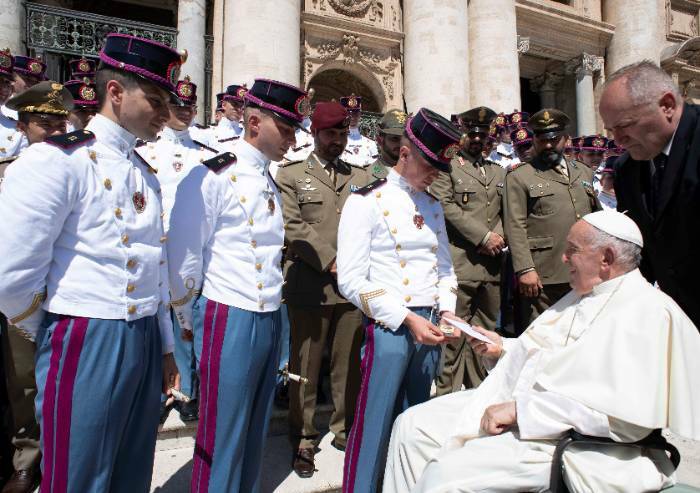 Nei giorni scorsi, Un gruppo di giovani Allievi Ufficiali appartenenti al 204° Corso 'Volontà' dell'Accademia Militare ha avuto l'onore di presenziare all'Udienza Generale tenuta da Sua Santità Papa Francesco in Piazza San Pietro, nel cuore del Vaticano. Dopo la conclusione della cerimonia, il Santo Padre ha incontrato il Comandante del Reggimento Allievi dell'Accademia Militare, Colonnello Elio Manes, accompagnato da don Marco Falcone, Cappellano Militare, dagli Allievi del 204° corso “Volontà” e da Ufficiali, Sottufficiali e Graduati dell'istituto di formazione militare.