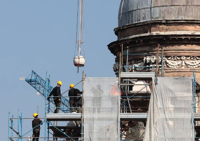 La prima delle sette sfere che decorano la sommità della facciata della chiesa del Voto, in via Emilia centro, è stata riposizionata al suo posto nella tarda mattinata di giovedì 28 febbraio. Il cantiere riprenderà lunedì 4 marzo e i lavori per l’installazione delle altre sei sfere si concluderanno in alcuni giorni.