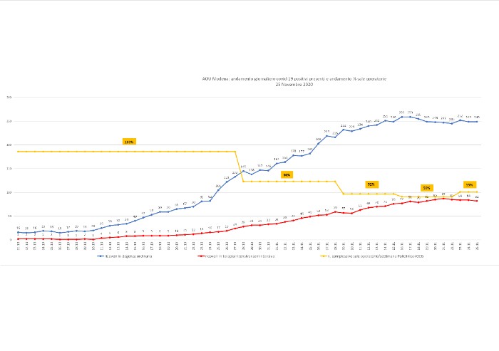 Nel grafico viene rappresentato l’andamento dei ricoveri di pazienti COVID in degenza ordinaria e in semintensiva/intensiva nel periodo dal primo ottobre al 25 novembre, e la correlazione temporale con la programmazione di sedute chirurgiche assegnate settimanalmente.