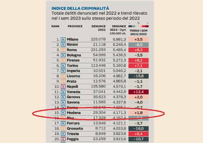 Modena risulta 15esima tra i 106 capoluoghi di provincia italiani in base all'indice della criminalità calcolato sul totale dei delitti denunciati nel 2022. In base alla classifica del Sole24Ore, stilata sui dati del Viminale, Modena ha fatto registrare oltre 29mila denunce in un anno, pari a 4171 denunce ogni 100mila abitanti.