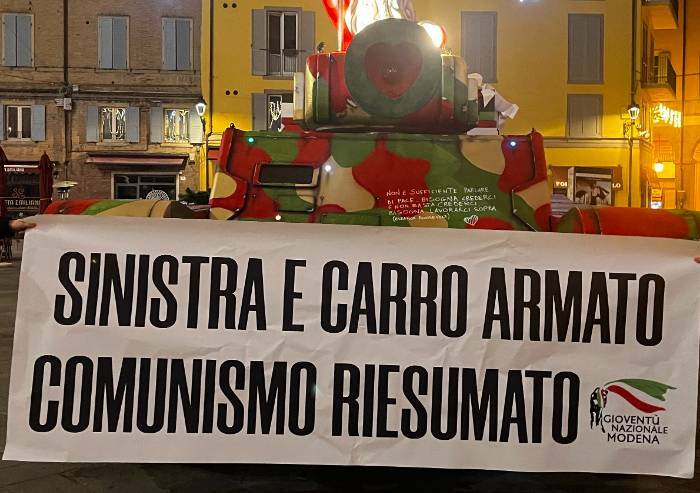 'Anche quest’anno Modena è salita alla ribalta della cronaca grazie, o per colpa, dell’annuale scultura di cattivo gusto di Lunati. Ma quest’anno, vorremmo fare i complimenti all’Amministrazione di Modena. Sì, complimenti, complimenti perchè fare installare in Piazza XX Settembre un carro armato in un periodo in cui la guerra è tornata prepotentemente a soffiare in Europa oltre che in Medio Oriente, ha superato anche il limite che ritenevamo non fosse oltrepassabile, a maggior ragione se pensiamo ai tanti profughi accolti nella nostra città e provincia'. A parlare è Lorenzo Rizzo, presidente provinciale Gioventù Nazionale Modena.