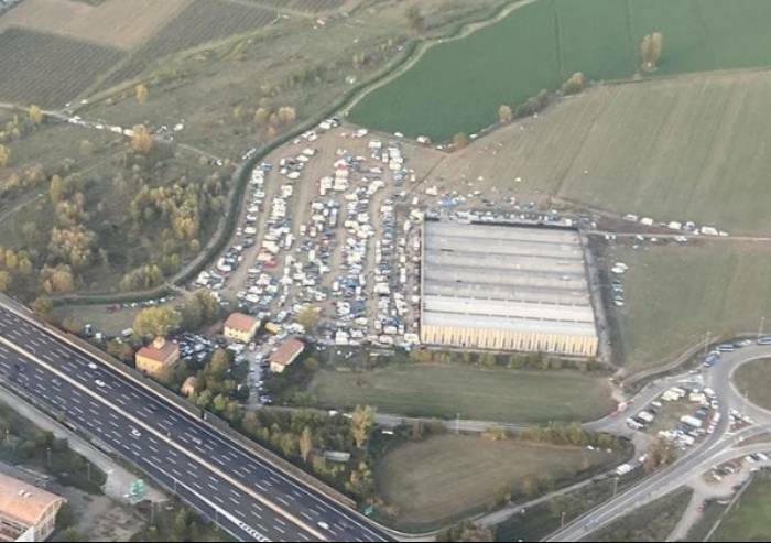 Nella foto (Paolo Ascari), il capannone durante il rave party, dove è ben visibile l'invasione di auto e camper nel campo adiacente