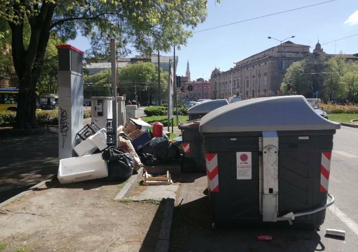 Modena, cumuli di rifiuti in centro. E sulla sfondo la Ghirlandina