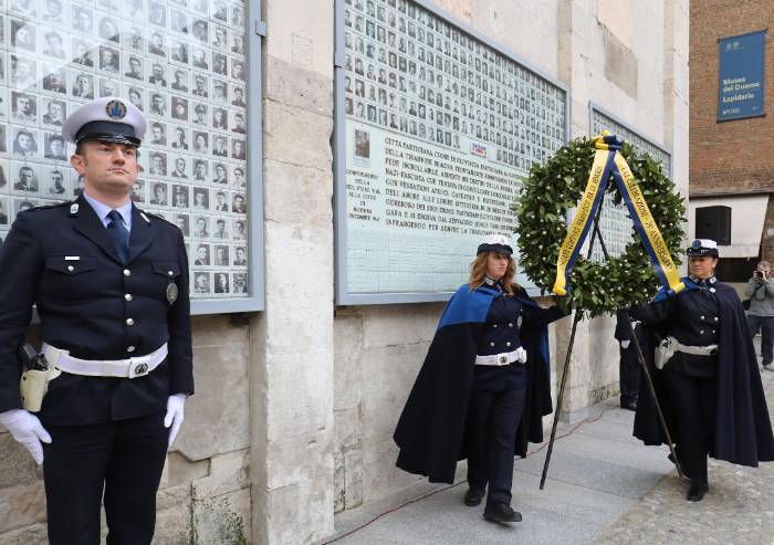 Le cerimonie oggi si sono aperte, con la partecipazione delle autorità cittadine e della banda, al cimitero di San Cataldo con la deposizione di una corona al Famedio per proseguire al Sacrario della Ghirlandina e quindi alla lapide a ricordo degli ex internati militari. Dopo l’omaggio alla lapide della Medaglia d’Oro alla Città di Modena, in cima allo scalone del Palazzo comunale in piazza Grande, è stata deposta una corona alla lapide in ricordo di Mario Allegretti, medaglia d’oro al valor militare, nell’atrio dell’Ateneo in via Università.