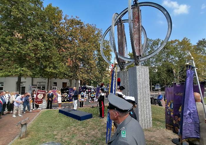 Intervenuto Dario Miglietta, presidente del Lions Club Modena Estense, che ha voluto realizzare l'opera che realizzata anche attraverso l'utilizzo di due blocchi di acciaio delle due torri crollate, e Cristian Bertolini, Governatore Lions del Distretto 108 Tb.
