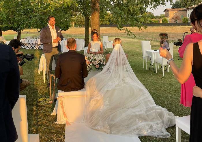 Non solo quella festa nuziale che a causa del lockdown e delle restrizioni imposte dall'emergenza Covid non avevano mai potuto organizzare e vivere con parenti ed amici. A due anni da quel si, in Municipio, a Modena, senza amici, parenti e con l'obbligo di mascherina, Beatrice De Maio, Consigliere comunale di Modena Sociale, e Alessandro Benedetti, hanno voluto unire ieri a quella festa nuziale con parenti e amici rinviata troppe volte, il rinnovo della promessa di matrimonio e una cerimonia in abito bianco nelle forme auspicate e impedite ai tempi del lockdown. Anziché recuperare 'solo' la festa nuziale per troppo tempo rinviata, perché non rivivere, anche la cerimonia? In abito bianco e alla presenza delle persone più care? Detto, fatto.