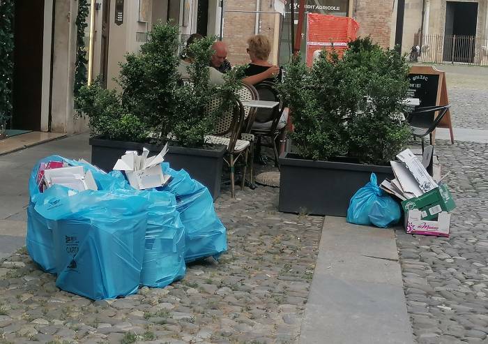 Fatto sta che il biglietto da visita anche oggi per numerosi frequentatori del centro e turisti in visita al cuore della città era quello rappresentato dall'immagine. Alle ore 13 la situazione nel tratto di strada pedonale all'angolo con Piazza Grande era questa. Con i tavoli per pranzare all'esterno con vista Duomo e e cumuli di rifiuti. Situazione analoga in via Cesare Battisti e perpendicolari alla via Emilia. Cumuli di sacchi di carta e plastica non ritirati.