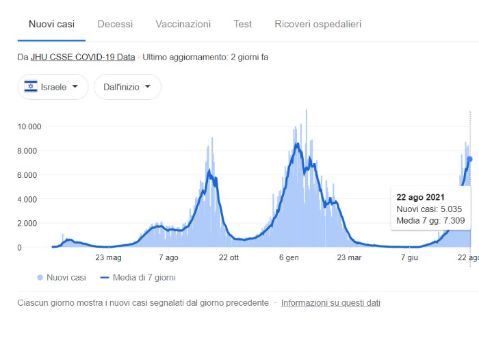 In Israele è stato somministrato solo il siero Pfizer, quello più utilizzato anche in Italia e si sono vaccinati con vaccinazione completa il 60% dei cittadini. Ieri vi sono stati 55 decessi e oltre 5mila nuovi casi con un trend del tutto paragonabile a quello pre-vaccinazione (grafico sotto).