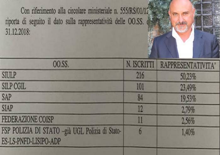 I dati aggiornati al 31 dicembre 2018 sui tassi di sindacalizzazione della questura di Modena, inviati come prassi al Ministero, sono arrivati nel momento in cui, da candidato e consigliere eletto a San Prospero, Bruno Fontana non è più segretario. Ma certamente riflettono, in termini temporali, oltre che sostanziali, gli effetti del suo operato. Esponente Siulp da già dal passato decennio, dopo una pausa dalla 'prima linea' di rappresentanza, aveva ripreso in mano il sindaco, nel momento di difficoltà di quest'ultimo, raddrizzando per cosi dire la barra e portandolo a risultati davvero particolari. Perché il Siulp oggi non è soltanto il primo sindacato tra gli agenti ed il personale della Polizia di Stato, ma è anche quello che per numero di iscritti, è in assoluto il più rappresentativo. Riunendo oltre il 50% (50,23, pari a 230 iscritti), dei 430 iscritti totali, staccando di più del doppio (anche se non si tratta di una gara), il Silp CGIL che riunisce 101 unità, raggiungendo il 23,49%, seguito dal Sap (19,53%), dal Siap (2,79%), dalla Federazione Coisp (2,56%) e dal FSP Polizia di Stato (già UGL Polizia di Stato - ES-LN-PNFD-Lisipo-Adp (1,40%)