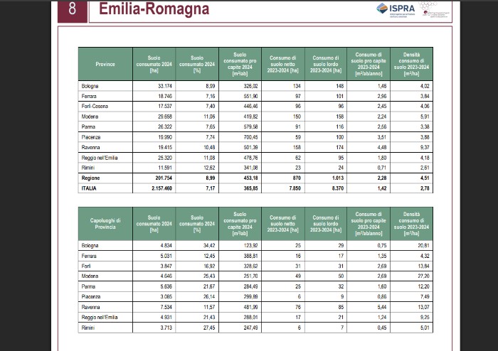 Rapporto Ispra, in Emilia Romagna il maggior consumo di suolo annuale