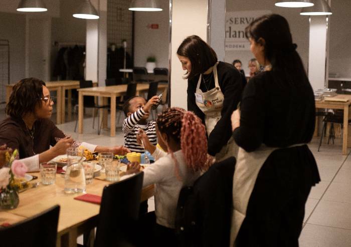 La location, che durante il giorno funge da self service aperto al pubblico, accoglie due sere a settimana coloro che vivono in condizioni di disagio economico e isolamento sociale, in particolare famiglie, giovani e anziani soli. La collaborazione con le parrocchie della città e con i Servizi Sociali del Comune di Modena, insieme al supporto dei volontari, garantiscono un’accoglienza confortevole. La cappella è decorata dagli affreschi di due artisti locali, Luca Zamoc e Luca Lattuga, che raffigurano la leggenda di San Geminiano, patrono di Modena, omaggiando così la città e le sue tradizioni.